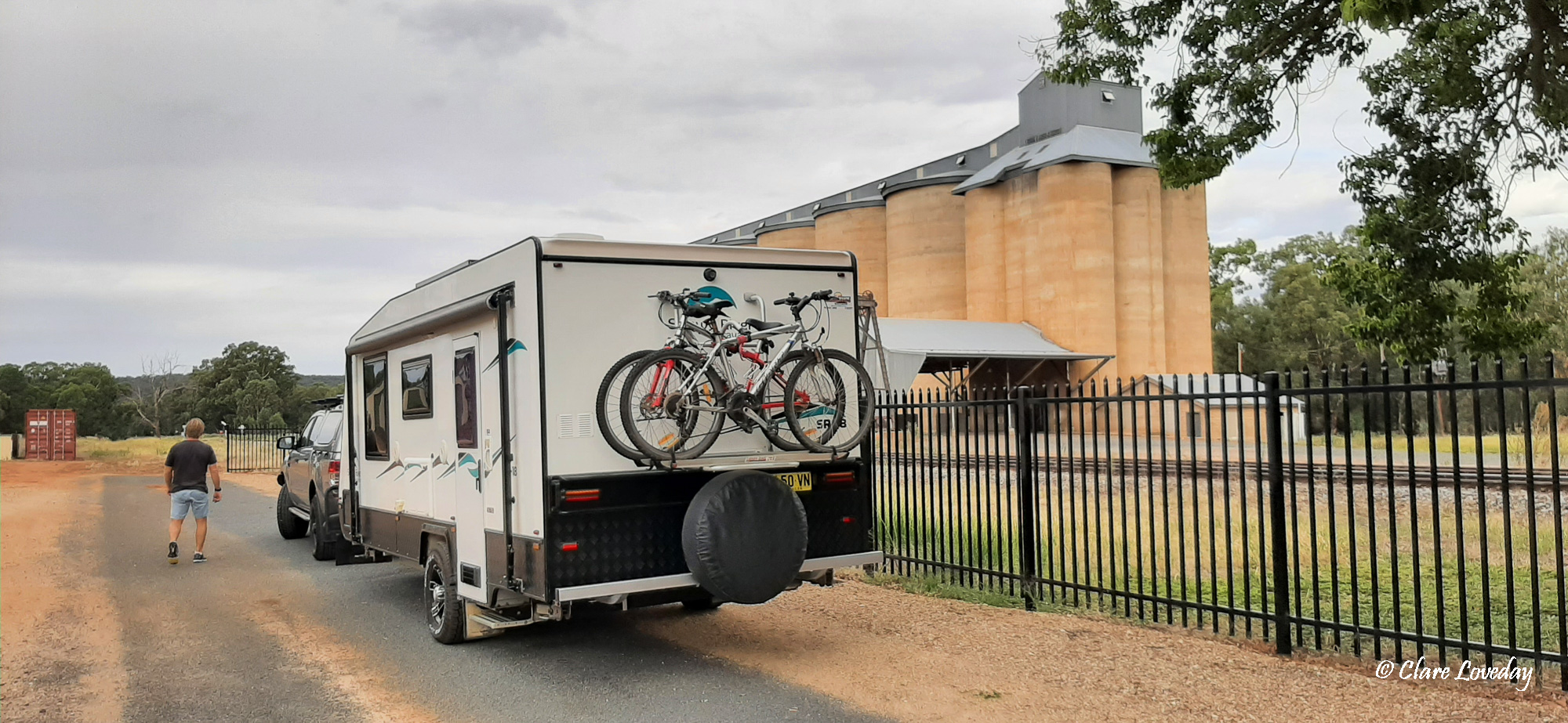 We woke to continual rain and dense fog – a quick call from the Hunters who had already arrived at the meeting place at Bulli Tops – the fog was too dense to safely stop so we decided to meet at Goulburn . This suited the Wells to a tee as they had rung to say that they were delayed – the new bike rack installed on the front of the van for their luxurious e-bikes had nearly taken out the back of their car as they drove out so Dave had to stop and reverse the bracket to prevent any damage to the Pearl!