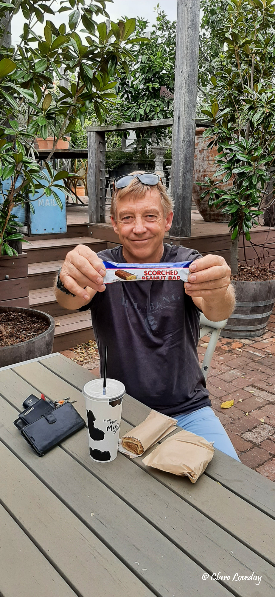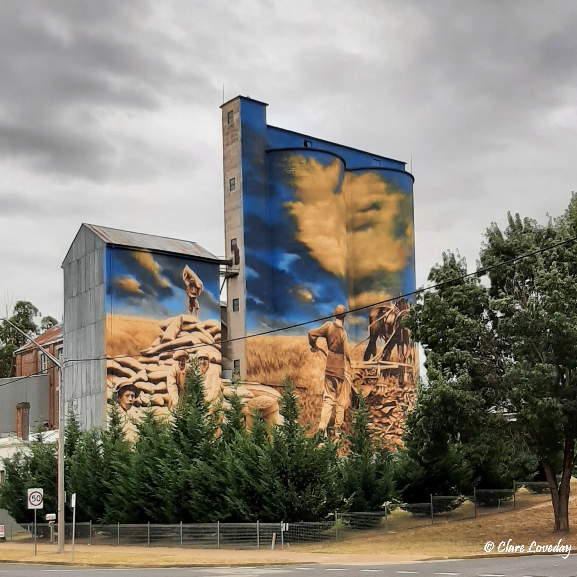 A quick stop at Harden for lunch at Jackson’s Bakery and Café where Trev was excited to find they sold scorched peanut bars! We passed an amazing painted silo and shed – a huge work of art but such detail.
