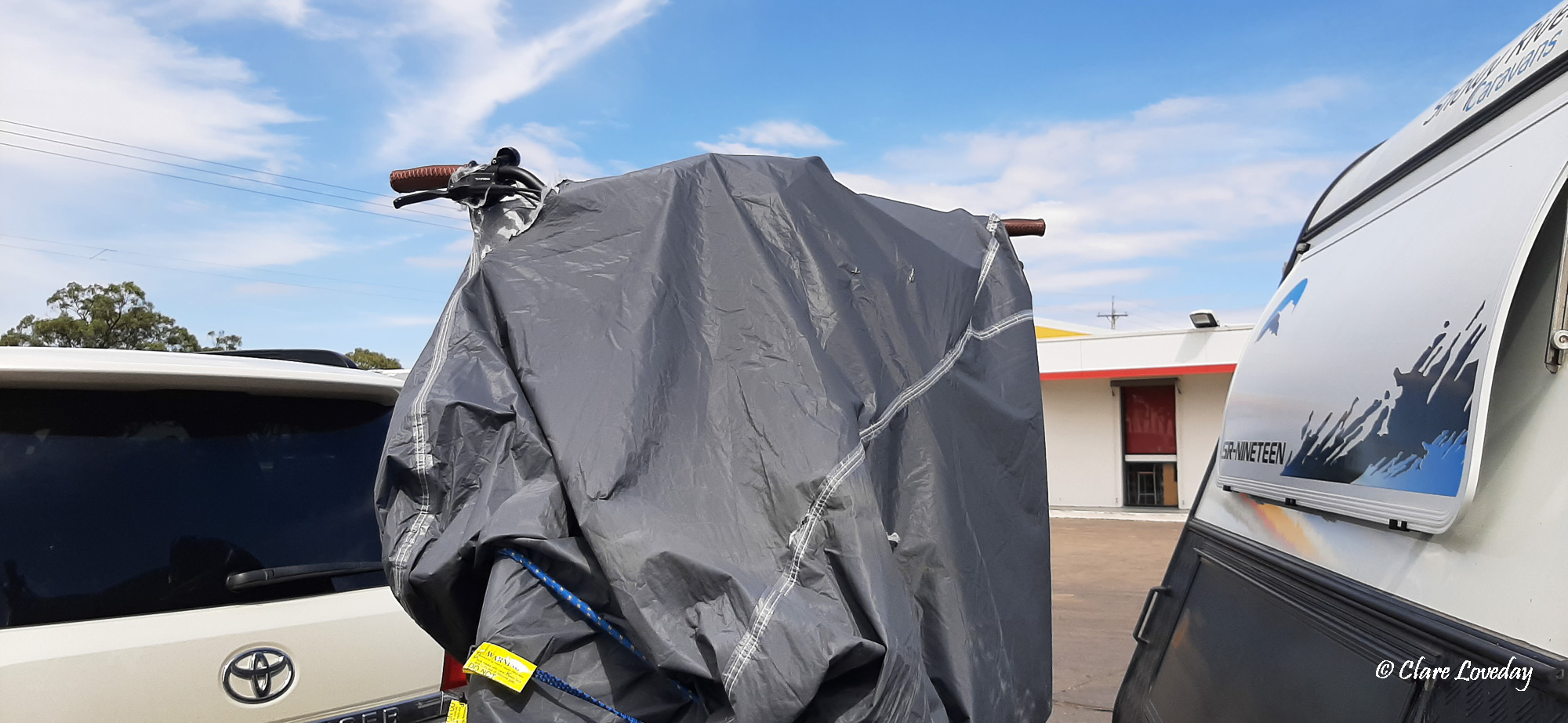 Once we passed through Narrandera the sun came out as we travelled along the Hay Plain towards Hay. Pulling in at Hay to have some lunch, Rose and Dave noticed to their dismay that the bike covers they had bought in Goulburn were also not robust enough!!