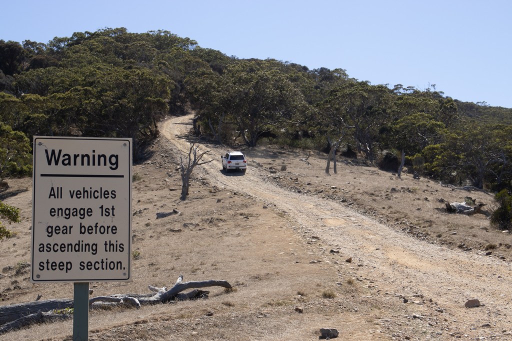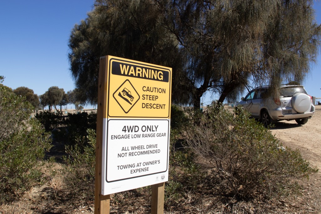 Entering the Park, we hit dirt roads and came to the turnoff to Blowhole Beach – a steep descent on dirt roads – with a warning at the start…