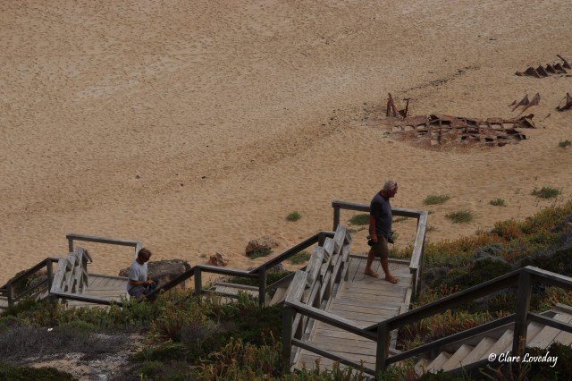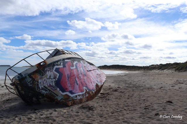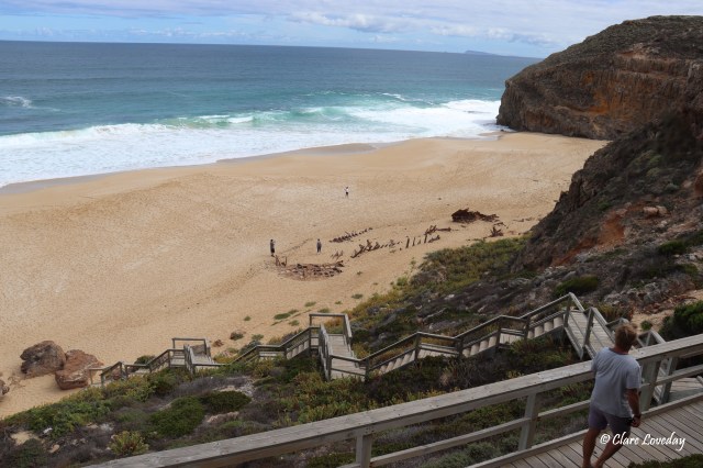 Carefully making our way down the steep staircase we got down to the beach and walked along to the wreck. The Ethel was a three masted iron barque built in Sunderland, England in 1876. On 2nd January, 1904, after damaging its rudder at nearby Cape Spencer in a south-westerly gale, it was driven ashore, with the loss of one life. The coastal steamer S.S. Ferret attempted to aid the Ethel without success and notified authorities. Ironically the Ferret ran aground on the same beach 16 years later on the 14th February 1920