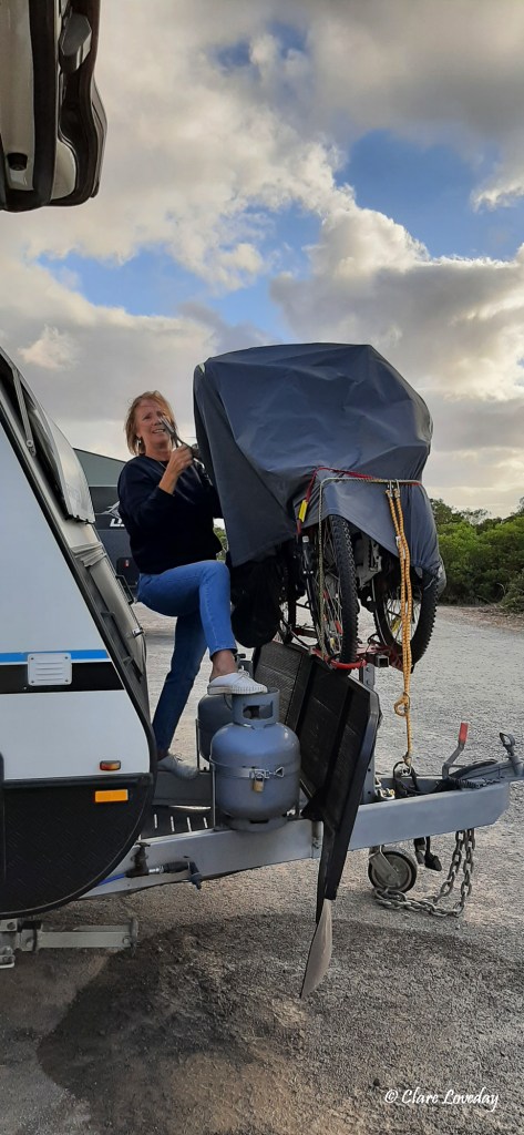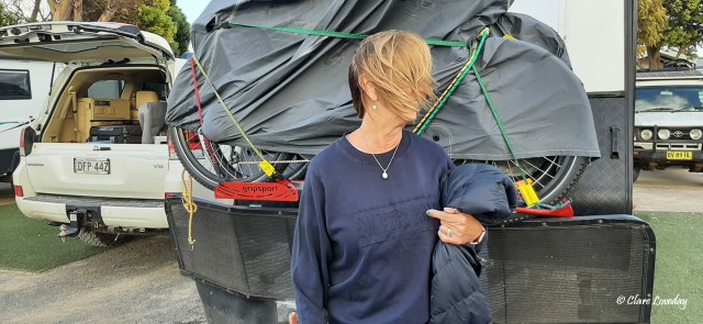 Rose tried to secure the deteriorating bike covers they had purchased in Goulburn with little success…. getting a major blow dry at the same time.