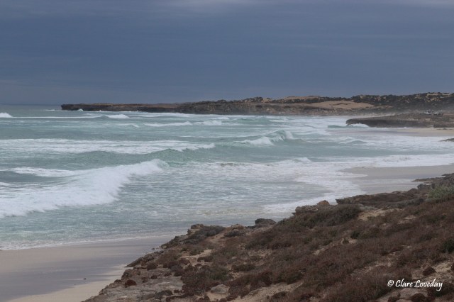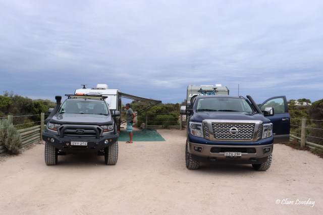 The rain had stopped but it was still overcast and windy – the campground at Sheringa was great! Hard level sites easy to access right on the beach but protected by shrubbery. The amenities had a couple of outdoor showers and a flushing toilet (very unusual in a “free camp” ) which were clean and well maintained by Elliston Council.
