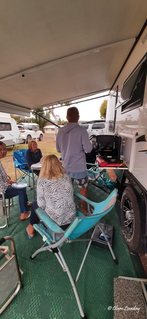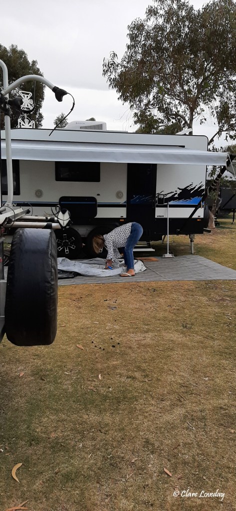 The pack up at Coffin Bay began early for Rose and Dave who were rustling around before the rest of us – Rosie determined to repair the dust covers for the bikes AGAIN – this time with the blue painters tape usually reserved for covering the vents and cracks before hitting the dirt roads….. We all struggled somewhat as it was raining so packing up was not as pleasant as normal!