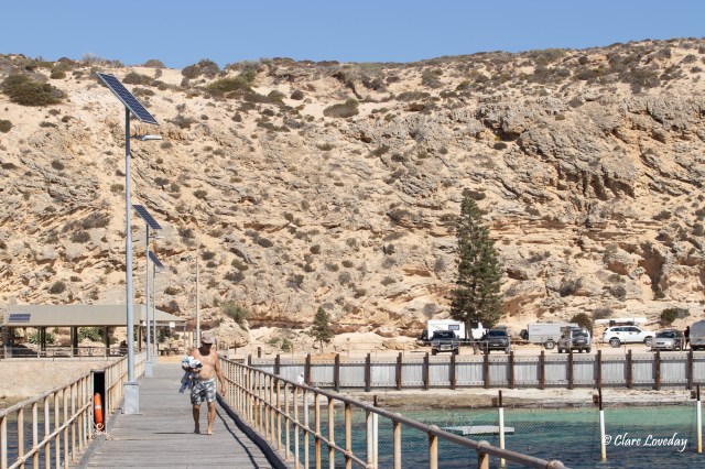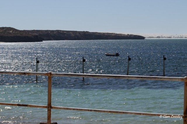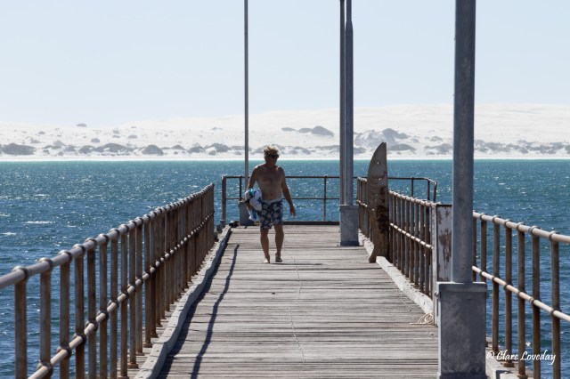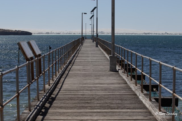 Arriving at the jetty we noticed that Klaus and Beryl were no longer there – we had a walk along the jetty and Trev jumped in for a quick swim in the netted area – but the wind was still howling so we headed back for Penong and lunch…