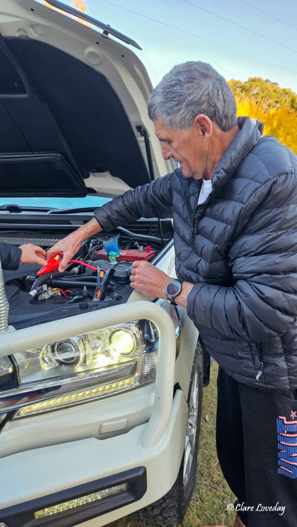 but as we were preparing to leave it was apparent that the Wells had the jump on all of us… rather they needed a jump as the fridge had not changed over to gas overnight and had drained their car battery… Branch could not believe his luck – an incident within less than 24hrs after leaving home… and Dave’s jumper leads just did not cut it.