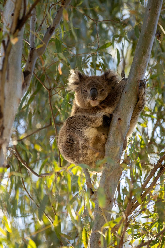Apparently you could see koalas in the area so we walked around for a while and saw none – so made our way back to camp… and there on the edge of the campsite Rosie found a koala asleep in a gum tree – he was so comfortable but sleepily opened his eyes while we were taking pics…