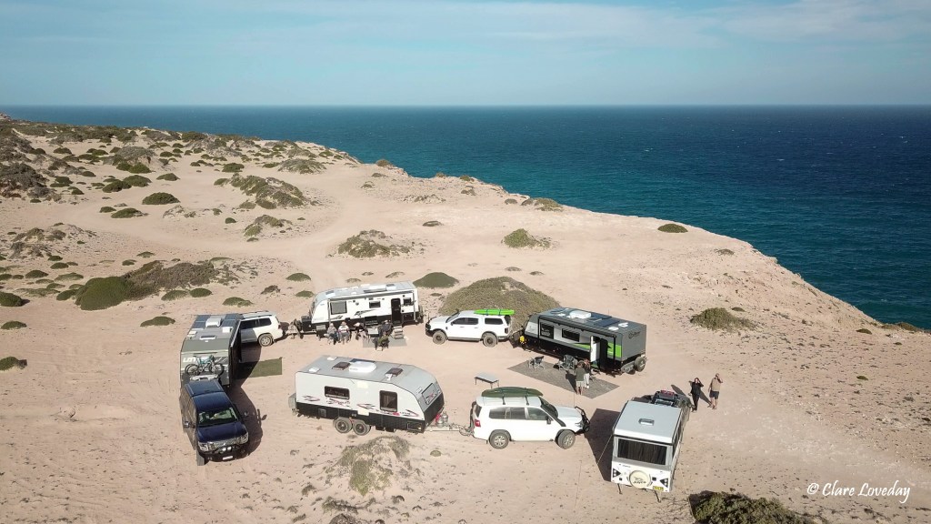We arrived at the Bunda Cliffs Campsite and after a few discussions settled on a wagon-train style campsite not too far from the cliffs edge but a little protected from the howling wind (?). With Kerry directing the traffic, we formed a perfect wagon train and got out to explore the area.