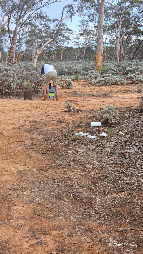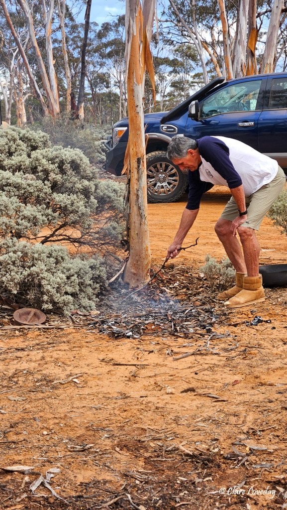We headed back to camp only to find a slight emergency – it appeared that Gordie had emptied the fire pit from last night assuming it was completely out however when casting onto the ground the leaf litter and caught alight instantly – a testimony to the dryness of the area. Gordie was madly trying to putout the smouldering leaves with a stick and the soil…. Fireman Trev came to the rescue with a kettle of water and the issue was quickly resolved much to Gordie’s relief…
