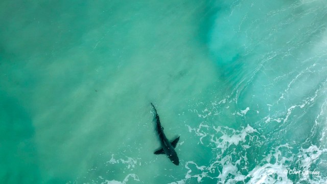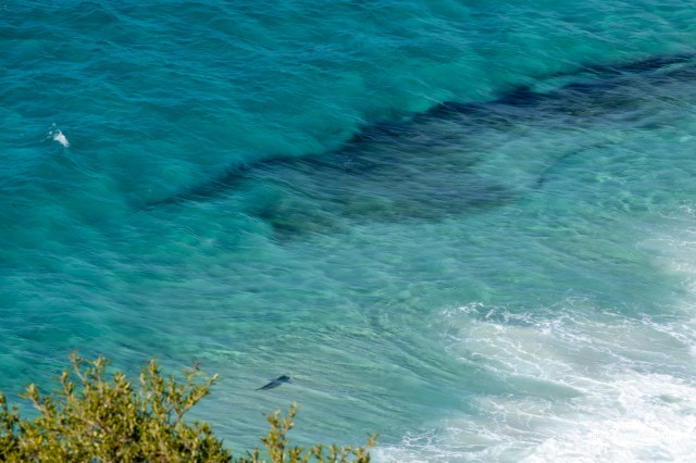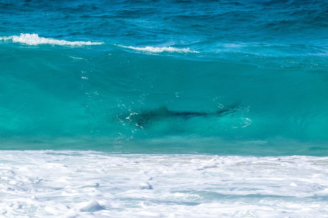 While looking down at the beach I noticed what I thought was a dark shape moving in the waters close to shore – sure enough it was a large shark circling a school of fish. I went back to the car and grabbed the zoom lens in the hope of capturing some pics – amazingly the shark was still there, and I got a couple of shots – it looked like a great white.