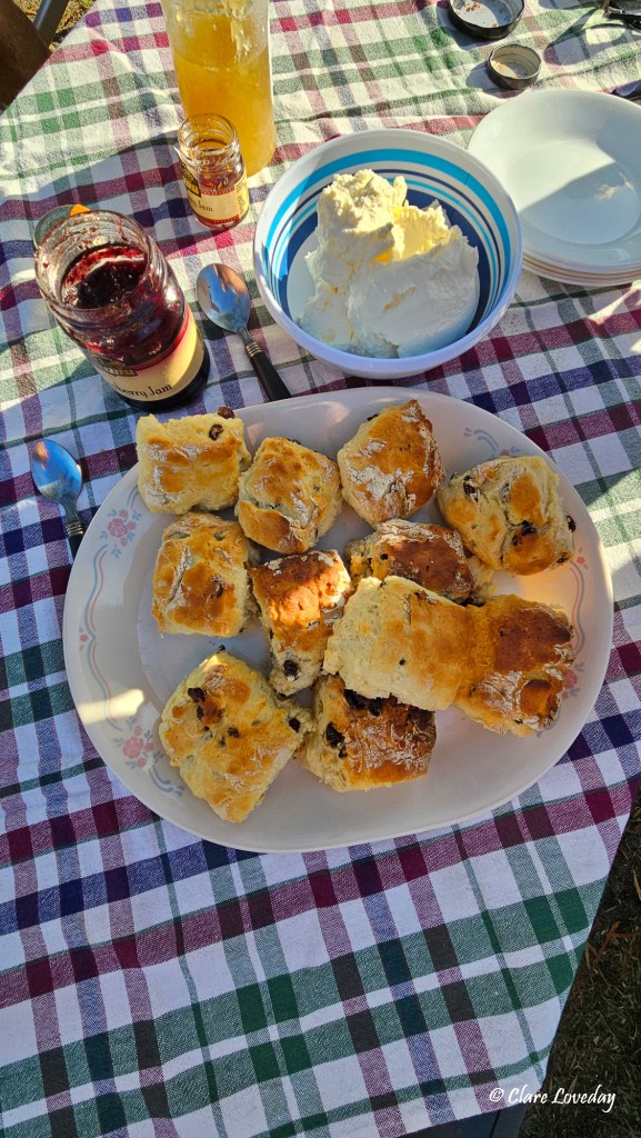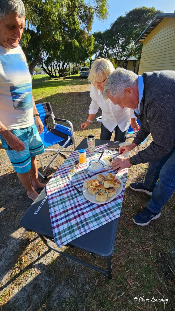 Arriving back at the campsite we could smell the tantalising odour of baking scones… Rose and Dave arrived back from their shopping trip just in time and we sat down to enjoy a cuppa and scones, jam and cream – the BEST SCONES EVER!