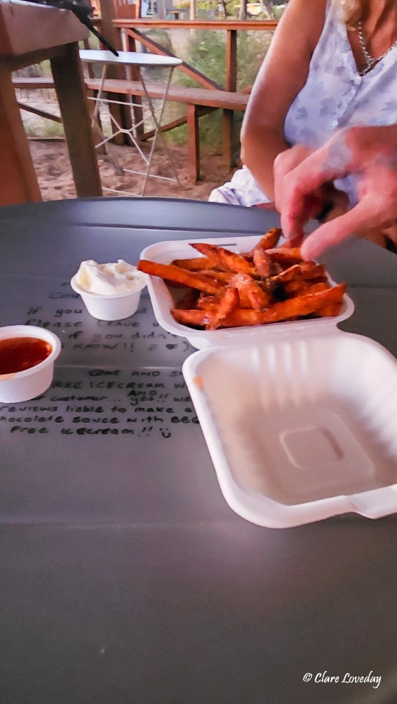 Back at camp, Klaus and Beryl had indulged in dessert from the Food Truck which comes to Coro every Saturday and Sunday – the single mum who runs it had not made enough to pay for her petrol today so we went over to buy ice-creams as well… and Gordie bought some sweet potato fries which turned out to be the BEST EVER….