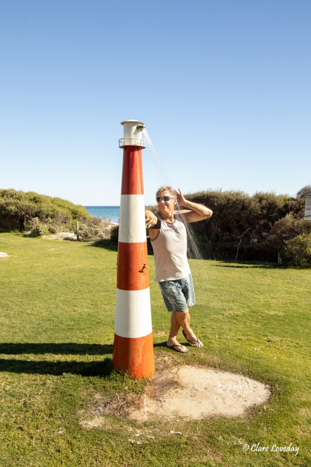 After lunch we drove up to the famous Point Moore Lighthouse painted red and white stripes…. Trev took advantage of the miniature lighthouse shower…