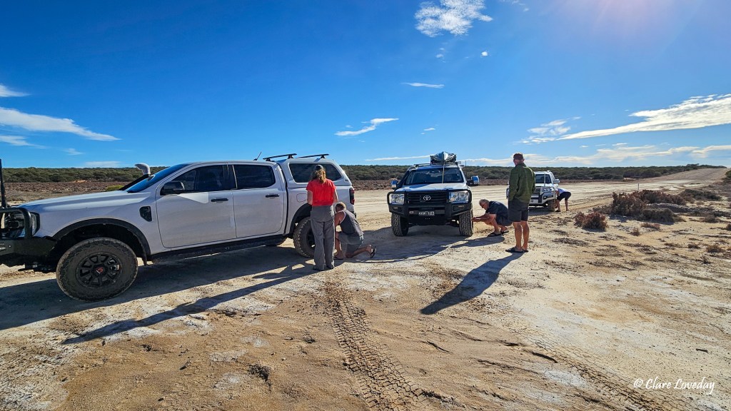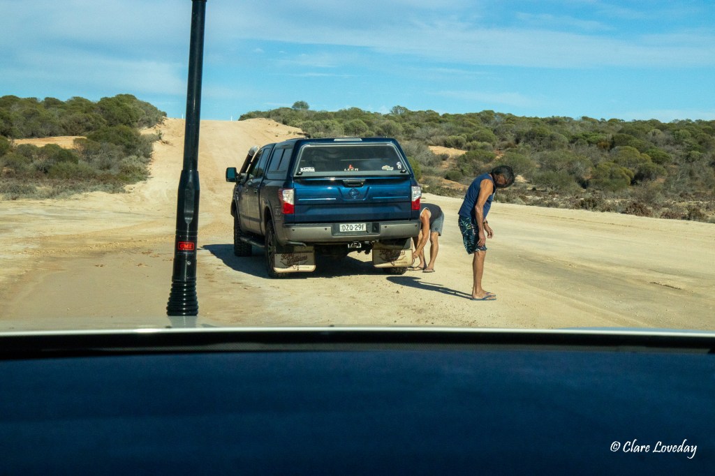 and finally arrived at the section where the unsealed road began – we let the tyres down partially when we stopped at a clay pan as the road was somewhat corrugated already…the flies were horrendous, and Gordie was seen doing a rather random, awkward fly dance while Trev assisted with his tyre pressures…