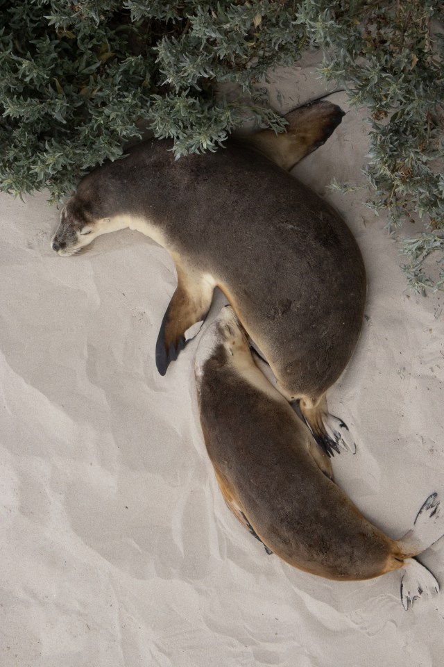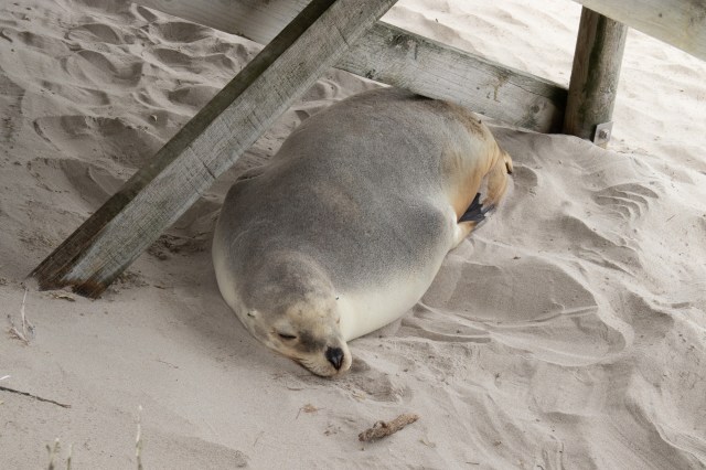 The sea lions spend 2-3 days out to sea at a time hunting for food up to 100kms south of KI and then return and spend 2-3 days recuperating and sleeping on the beach and in the dunes as they are exhausted from the continual swimming and feeding. There are around 1000 permanent resident sea lions at Seal Bay in KI.