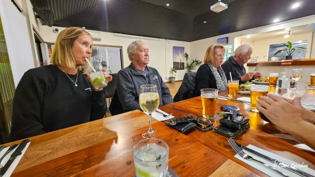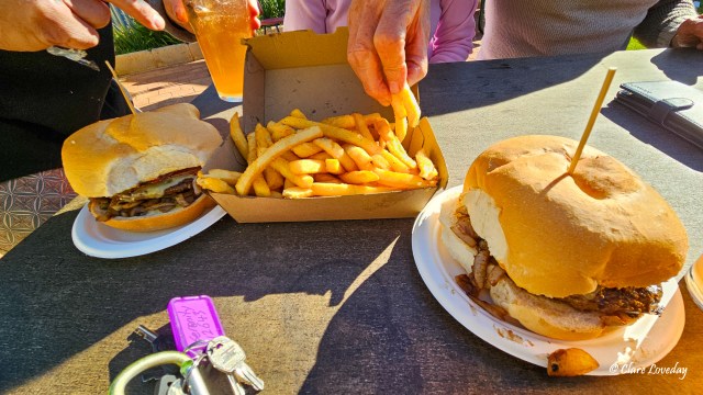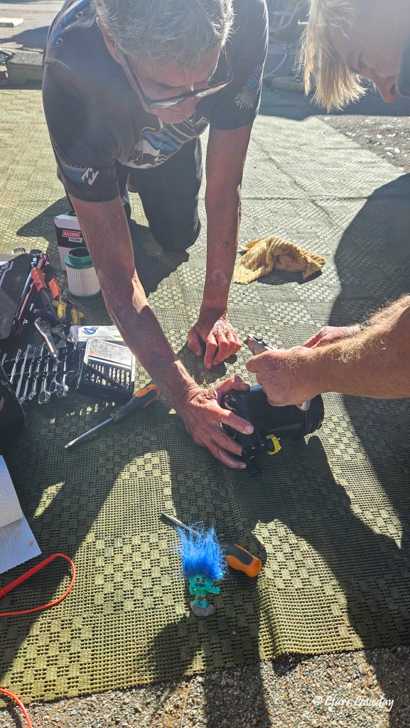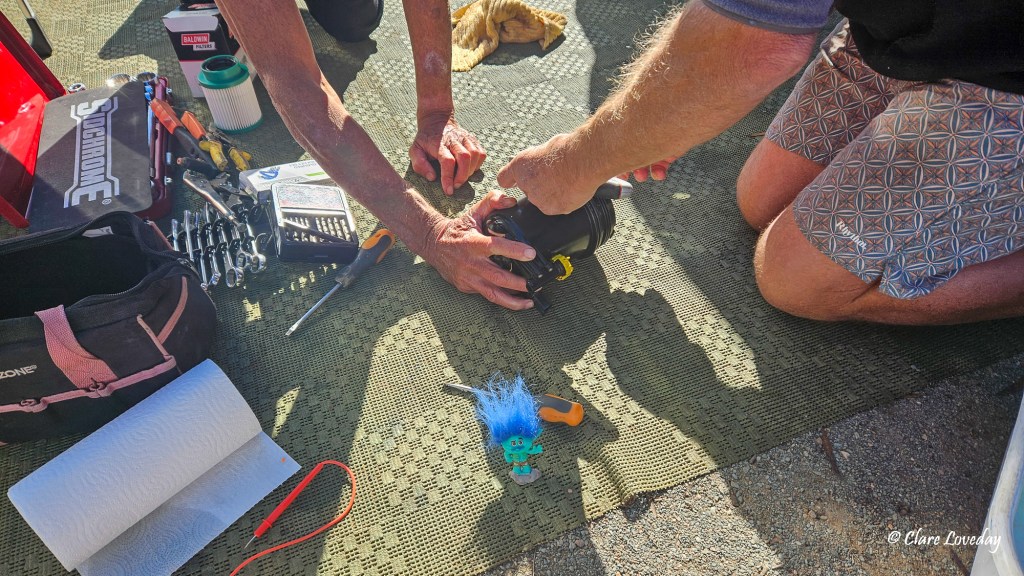 At the café we called Gordie and he gave us the great news that his car was fixed – the mechanic had put it up on the hoist and had managed to see that the fuel filter needed another turn to tighten it fully – fixing the issue!!!