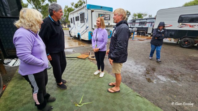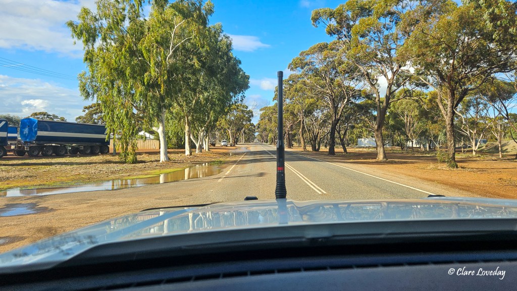 We needed to come up with a plan B to get to Hyden, and looking on Google Maps I could see that there was an option that was about 25mins longer (but quite a few more kms) that went via Merredin and then south to Narembeen then via Kondinin to Hyden… and it looked like to whole way may have been sealed – Trev showed the guys and they confirmed that yes – those roads were sealed and still open so we quickly got on the road again to take the longer detour and hopefully reach Wave Rock Caravan Park by about 330 that afternoon… As we left the rain continued to pelt down…..